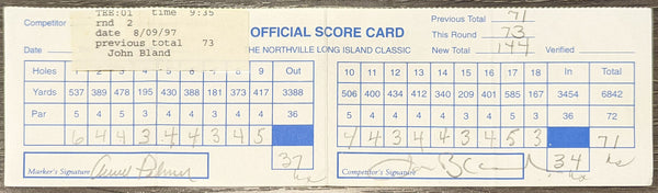 This Autographed 1997 Match Used Senior Tour Northville Long Island Classic Score Card has been Personally Signed by Arnold Palmer & John Bland. This item is 100% Authentic to include a Certificate of Authenticity (COA) / hologram by Beckett Authentication Services. The authenticity can be verified on Beckett Authentication Services website.