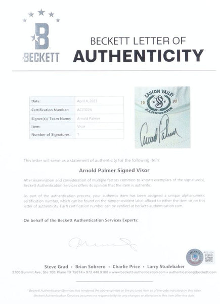 Featured is an Arnold Palmer signed 1992 PGA US Senior Open visor. This visor has been hand signed by Palmer and comes with the Beckett hologram and letter of authenticity. This visor would make a great addition to any sports memorabilia collection! SPECIFICATIONS Autographed By: Arnold Palmer Team: Sport: Golf-PGA Authentication: Beckett