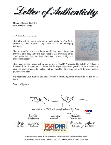 This is a 3 Page Hand Written 1963 Letter Authentic Signed that has been Personally Signed & Autographed by Bobby (Robert T) Jones. This item is 100% Authentic to include a Certificate of Authenticity (COA) / hologram by PSA/DNA #Z05381.We offers a 100% Lifetime Guarantee on all Autographed & Signed Bobby (Robert T) Jones memorabilia.