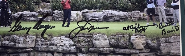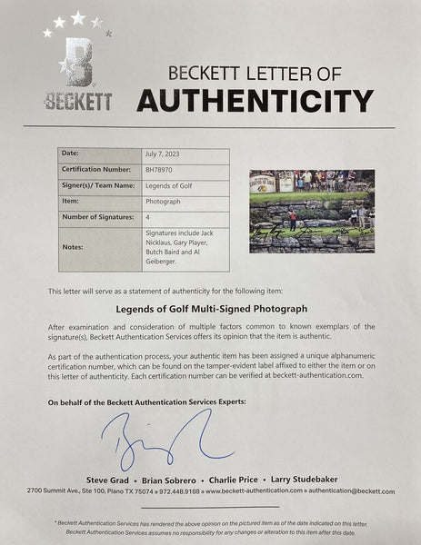 Featured is a Jack Nicklaus, Gary Player, Butch Baird, and Al Geiberger signed 8x10 PGA golf photo. This photo has been hand signed by Nicklaus, Player, Baird and Geiberger and comes with the Beckett hologram and letter of authenticity. This photo has been professionally framed and matted and is approximately 11x14. This photo would make a great addition to any sports memorabilia collection!. SPECIFICATIONS Autographed By: Team: Sport: Golf-PGA Authentication: Beckett Grading Services