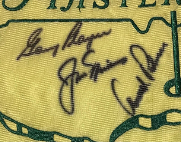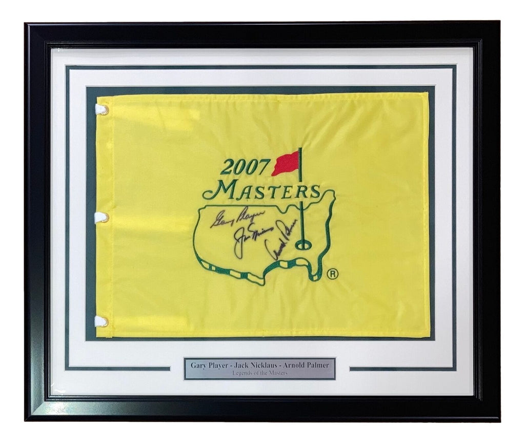 Featured is a Jack Nicklaus, Arnold Palmer and Gary Player signed Masters golf flag. This flag was hand signed by Nicklaus, Palmer and Player and comes with the Beckett hologram and letter of authenticity. This flag has been professionally framed and matted and is approximately 22x27. This flag would make a great addition to any sports memorabilia collection! SPECIFICATIONS Autographed By: Team: Sport: Golf-PGA Authentication: Beckett Grading Services
