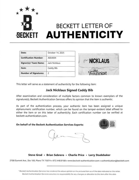 This 2x Autographed The Tradition Caddy Bib Shirt has been Personally Signed by Jack Nicklaus. This item is 100% Authentic to include a Certificate of Authenticity (COA) / hologram by Beckett Authentication Services. The authenticity can be verified on Beckett Authentication Services website.