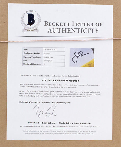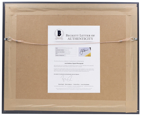 Featured is a Jack Nicklaus signed framed 11x14 golf photo. This photo was hand signed by Jack Nicklaus and has been authenticated by Beckett authentication services. Included with the photo is a Beckett hologram and letter of authentication. This frame measures approximately 16x20 in total size, and is ready for display. This item would make a great addition to any sports memorabilia collection!. SPECIFICATIONS Autographed By: Nicklaus Team: Sport: Golf-PGA Authentication: Beckett Grading Services