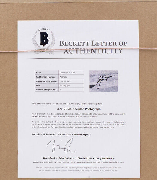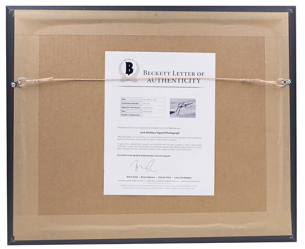 Featured is a Jack Nicklaus signed framed 11x14 golf photo. This photo was hand signed by Jack Nicklaus and has been authenticated by Beckett authentication services. Included with the photo is a Beckett hologram and letter of authentication. This frame measures approximately 16x20 in total size, and is ready for display. This item would make a great addition to any sports memorabilia collection!. SPECIFICATIONS Autographed By: Nicklaus Team: Sport: Golf-PGA Authentication: Beckett Grading Services