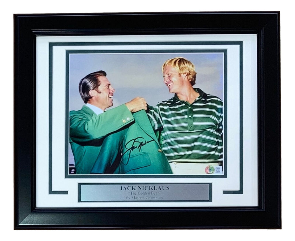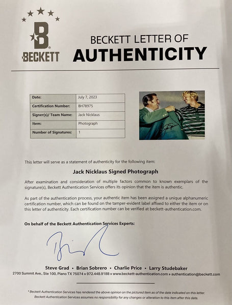 Featured is a Jack Nicklaus signed 8x10 photo. This photo has been hand signed by Nicklaus and comes with the Beckett hologram and letter of authenticity. This photo has been professionally framed and matted and is approximately 11x14. This photo would make a great addition to any sports memorabilia collection! SPECIFICATIONS Autographed By: Team: Sport: Golf-PGA Authentication: Beckett Grading Services