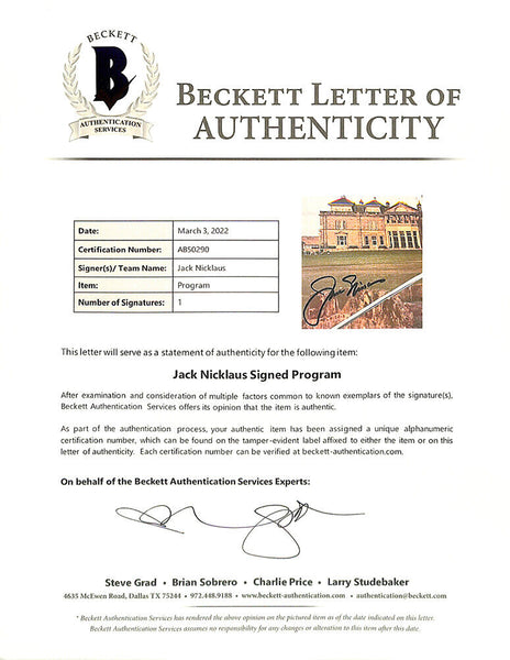 Featured is a Jack Nicklaus signed The Open St Andrews 2005 golf program. This program was hand signed by Jack Nicklaus and has been authenticated by Beckett authentication services. Included with the program is a Beckett hologram and letter of authentication. This item would make a great addition to any sports memorabilia collection! SPECIFICATIONS Autographed By: jack Team: Sport: Golf-PGA Authentication: Beckett Grading Services