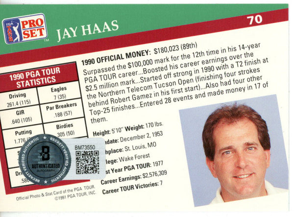 The number in the listing title is just an inventory sku for our records and is not the authentication number. This is the exact item that you will receive so please see pictures for condition. This is a trading card that was personally autographed by Jay Haas. Includes a certificate of authenticity from Beckett Authentication Services (BAS) and Denver Autographs.FREE SHIPPING within the USA on orders over $10!