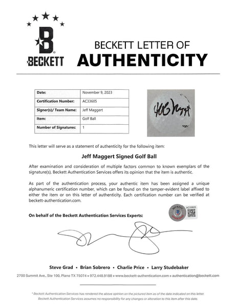 This Autographed Waste Management Open Logo Bridgestone Golf Ball has been Personally Signed by Jeff Maggert. This item is 100% Authentic to include a Certificate of Authenticity (COA) / hologram by Beckett Authentication Services. The authenticity can be verified on Beckett Authentication Services website.