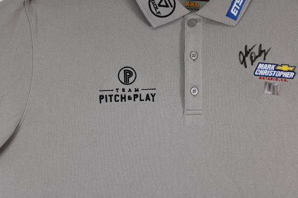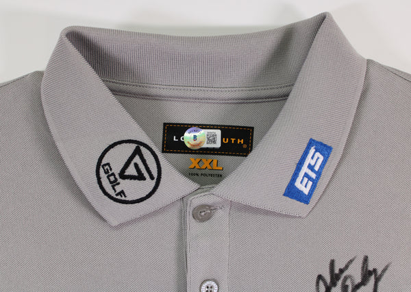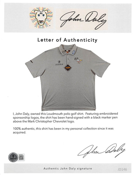 This Autographed Grey Team Pitch & Play Mark Christopher Chevy Rock Bottom Golf Trump Polo Shirt has been Personally Signed by John Daly. This item is 100% Authentic to include a hologram by Beckett Authentication Services. This item will come with an affixed Beckett Authentication Services (BAS) authentication sticker, which includes a scannable QR code to verify authenticity. Please note that Beckett no longer provides serial-numbered COA cards, and the attached BAS sticker will serve as the complete authentication for this item. The authenticity can be verified on Beckett Authentication Services website. This is a XX-Large sized Shirt. This match worn Folds of Honor quarter zip shirt has been worn by John Daly, and comes with a letter of Authenticity from John Daly certifying this is match worn & provenance of the item coming from his personal collection.