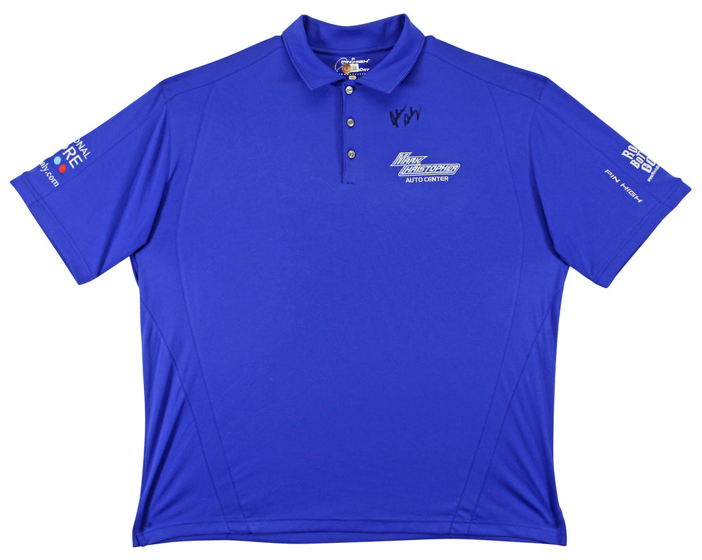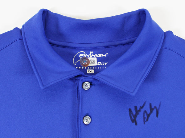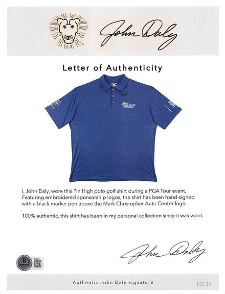 This Autographed Match Worn Blue Pin High Mark Christopher National Core Rock Bottom Golf Polo Shirt has been Personally Signed by John Daly. This item is 100% Authentic to include a hologram by Beckett Authentication Services. This item will come with an affixed Beckett Authentication Services (BAS) authentication sticker, which includes a scannable QR code to verify authenticity. Please note that Beckett no longer provides serial-numbered COA cards, and the attached BAS sticker will serve as the complete authentication for this item. The authenticity can be verified on Beckett Authentication Services website. This is a XX-Large sized Shirt. This Match Worn Blue Pin High Mark Christopher National Core Rock Bottom Golf Polo shirt has been worn by John Daly, and comes with a letter of Authenticity from John Daly certifying this is match worn & provenance of the item coming from his personal collection.