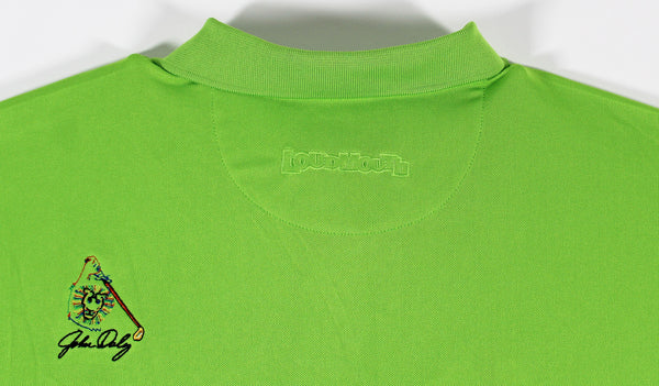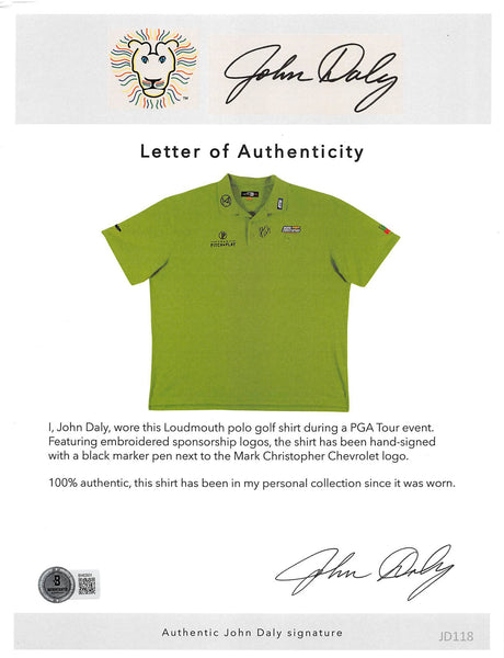 This Autographed Match Worn Green Loudmouth Mark Christopher Pitch & Play Trump ETS Rock Bottom Golf Polo Shirt has been Personally Signed by John Daly. This item is 100% Authentic to include a hologram by Beckett Authentication Services. This item will come with an affixed Beckett Authentication Services (BAS) authentication sticker, which includes a scannable QR code to verify authenticity. Please note that Beckett no longer provides serial-numbered COA cards, and the attached BAS sticker will serve as the complete authentication for this item. The authenticity can be verified on Beckett Authentication Services website. This is a XXX-Large sized Shirt. This Match Worn Green Loudmouth Mark Christopher Pitch & Play Trump ETS Rock Bottom Golf Polo shirt has been worn by John Daly, and comes with a letter of Authenticity from John Daly certifying this is match worn & provenance of the item coming from his personal collection.