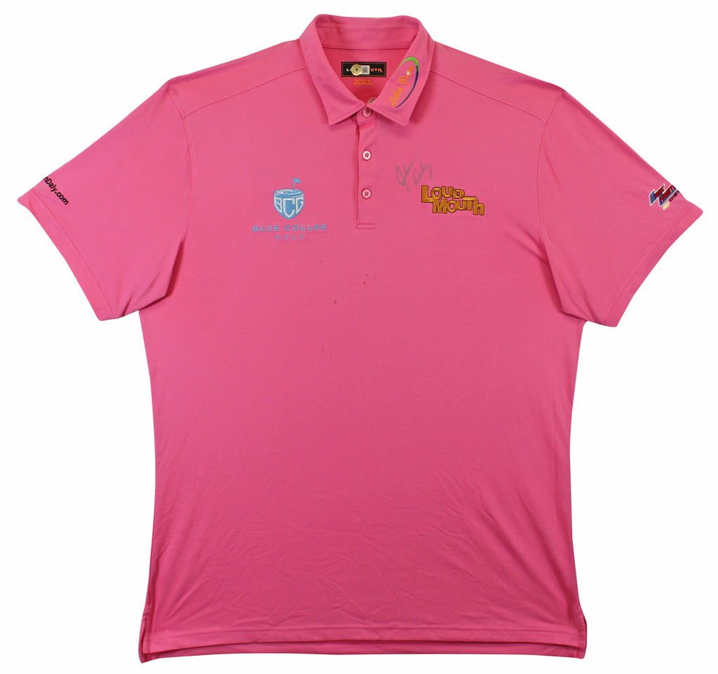 This Autographed Match Worn Pink Loudmouth Mark Christopher BCG Luber Bros Polo Shirt has been Personally Signed by John Daly. This item is 100% Authentic to include a hologram by Beckett Authentication Services. This item will come with an affixed Beckett Authentication Services (BAS) authentication sticker, which includes a scannable QR code to verify authenticity. Please note that Beckett no longer provides serial-numbered COA cards, and the attached BAS sticker will serve as the complete authentication for this item. The authenticity can be verified on Beckett Authentication Services website. This is a XX-Large sized Shirt. This match worn Folds of Honor quarter zip shirt has been worn by John Daly, and comes with a letter of Authenticity from John Daly certifying this is match worn & provenance of the item coming from his personal collection.