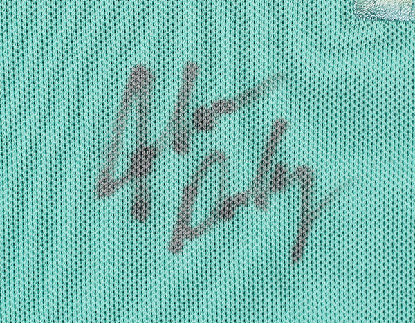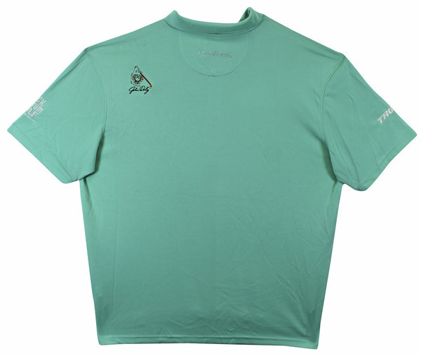 This Autographed Match Worn Teal Loudmouth Mark Christopher Pitch & Play ETS Trump Rock Bottom Golf Polo Shirt has been Personally Signed by John Daly. This item is 100% Authentic to include a hologram by Beckett Authentication Services. This item will come with an affixed Beckett Authentication Services (BAS) authentication sticker, which includes a scannable QR code to verify authenticity. Please note that Beckett no longer provides serial-numbered COA cards, and the attached BAS sticker will serve as the complete authentication for this item. The authenticity can be verified on Beckett Authentication Services website. This is a XX-Large sized Shirt. This Match Worn Teal Loudmouth Mark Christopher Pitch & Play ETS Trump Rock Bottom Golf Polo shirt has been worn by John Daly, and comes with a letter of Authenticity from John Daly certifying this is match worn & provenance of the item coming from his personal collection.