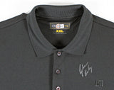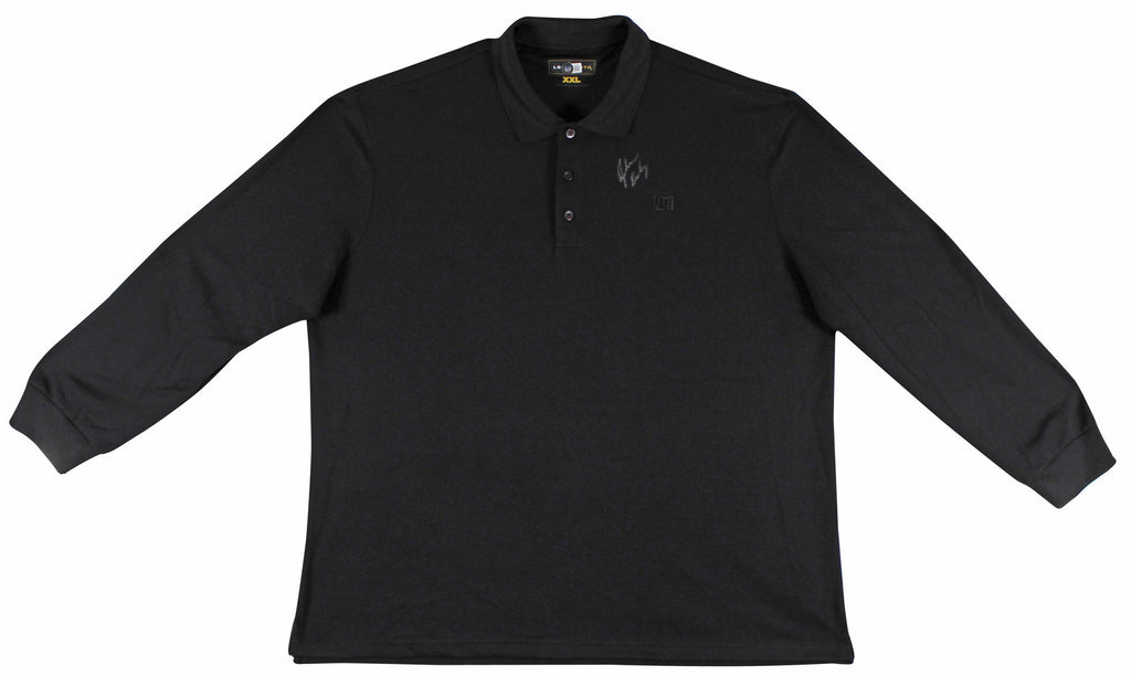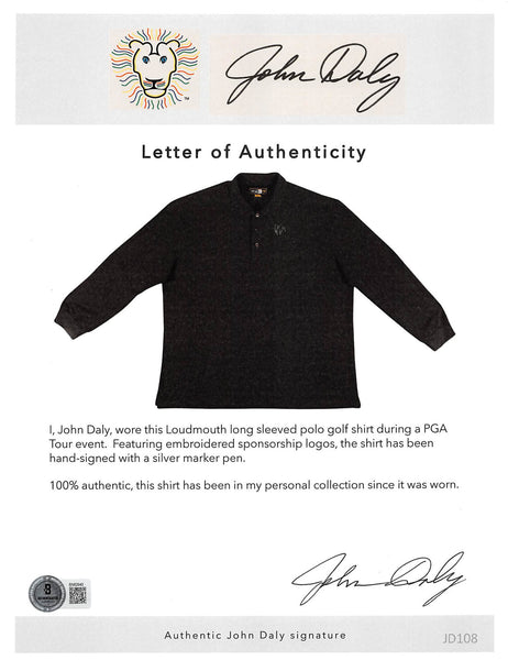 This Autographed Match Worn Black Long Sleeved Loudmouth Team Pitch & Play Mark Christopher Chevy Trump Rock Bottom Golf Polo Shirt has been Personally Signed by John Daly. This item is 100% Authentic to include a hologram by Beckett Authentication Services. This item will come with an affixed Beckett Authentication Services (BAS) authentication sticker, which includes a scannable QR code to verify authenticity. Please note that Beckett no longer provides serial-numbered COA cards, and the attached BAS sticker will serve as the complete authentication for this item. The authenticity can be verified on Beckett Authentication Services website. This is a XX-Large sized Shirt. This Match Worn Black Long Sleeved Loudmouth Team Pitch & Play Mark Christopher Chevy Trump Rock Bottom Golf Polo shirt has been worn by John Daly, and comes with a letter of Authenticity from John Daly certifying this is match worn & provenance of the item coming from his personal collection.