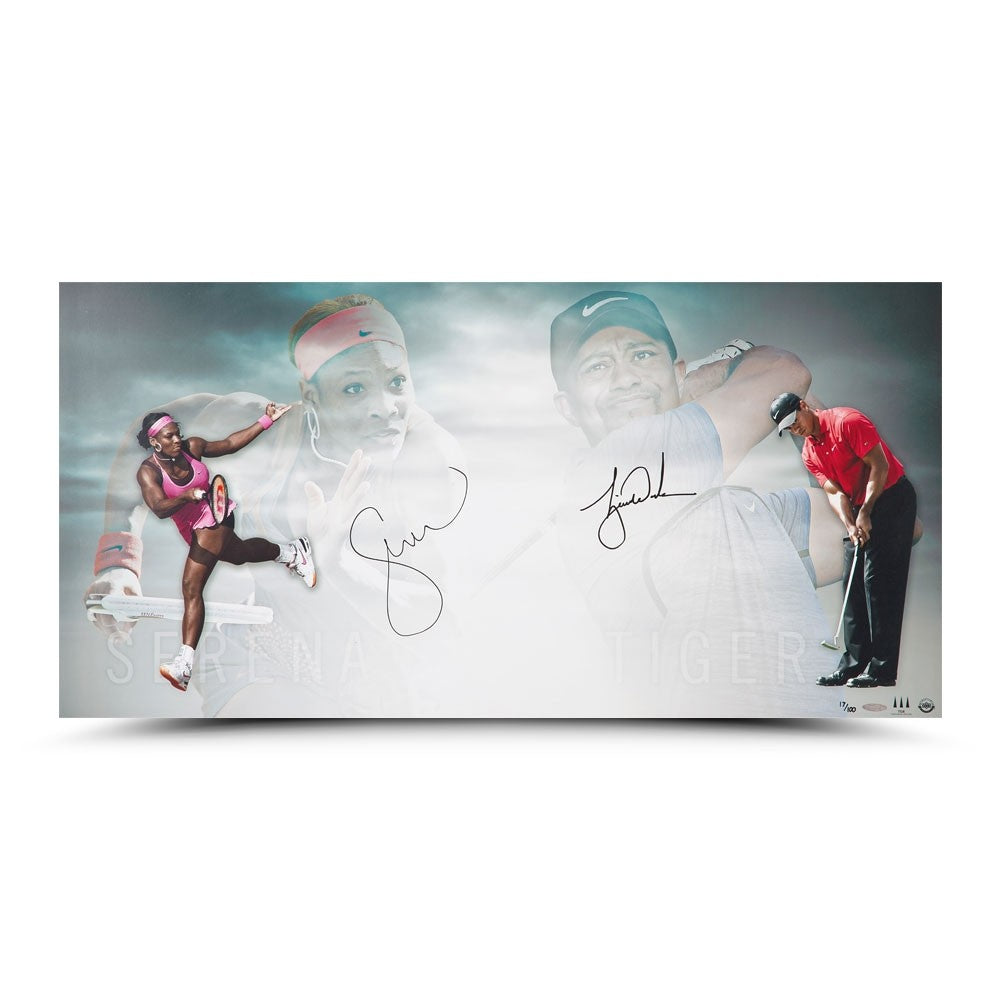 One of the marks of great athletes is their ability to remain singularly focused on the goal of winning from the beginning of an event to the end. Despite the influence of outside stimuli, championship athletes are easily able to block out distractions and keep their eyes on the prize. This uniquely designed image features two of the world’s greatest athletes in Serena Williams and Tiger Woods with that look of intense determination along with a pair of action images in their most athletic movements. Both athletes were the world’s best at their crafts in their primes, and both athletes show no signs of giving up their greatness. While Serena spent 186 consecutive weeks at No. 1 in the WTA rankings, Tiger spent 281 straight weeks at the top spot of the Official World Golf Ranking. These two are truly icons in their sport and have greatly influenced generations to come. Woods and Williams have autographed this limited edition (100) “Luminaries” 36” x 18” designed image in black paint pen. Their signatures are deemed authentic by virtue of Upper Deck Authenticated’s Five-Step Process.