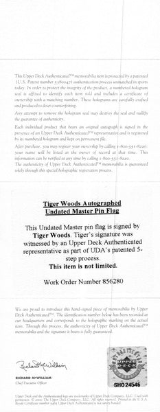 This Autographed Masters Pin Flag has been Personally Signed by Tiger Woods. This item is 100% Authentic to include a Certificate of Authenticity (COA) / hologram by UDA. The authenticity can be verified on Upper Deck Authentic website.