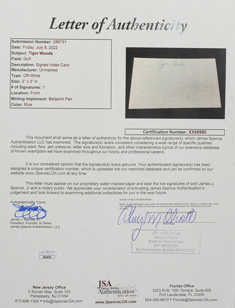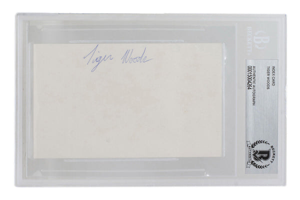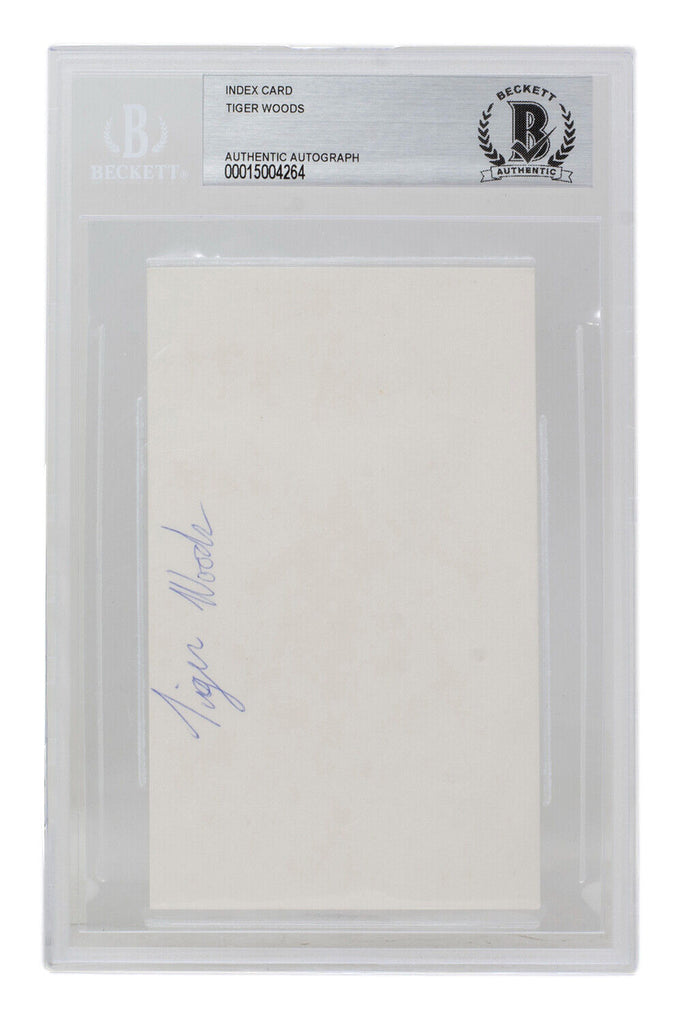 Featured is a Tiger Woods signed index card. This card has been signed by Tiger Woods and has been slabbed and authenticated by Beckett authentication services. Also included is a JSA Letter of Authentication. This item would make a great addition to any sports memorabilia collection. SPECIFICATIONS Autographed By: Tiger Woods Team: Sport: Golf-PGA Authentication: Beckett Grading Services
