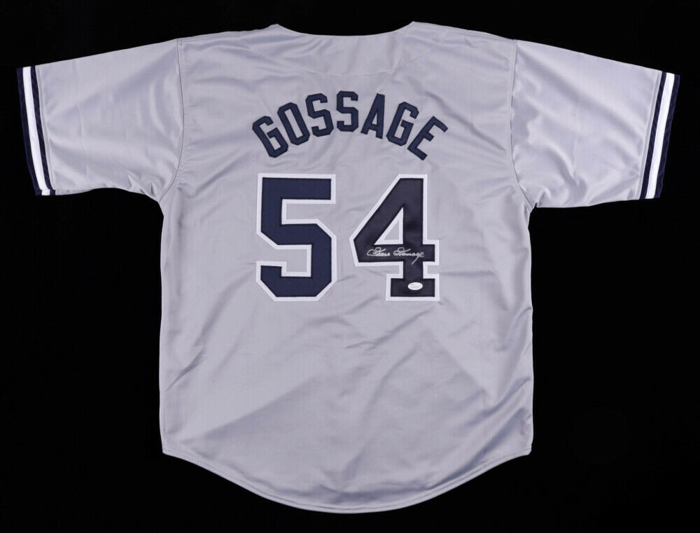 Custom on-field style jersey. Everything sewn on, size XL. Hand-signed and inscribed in silver paint pen by Goose Gossage (HOF).The autograph includes an official James Spence Authentication (JSA) hologram for authenticity purposes. The signing of this item was witnessed by JSA.Authentication: JSA Hologram