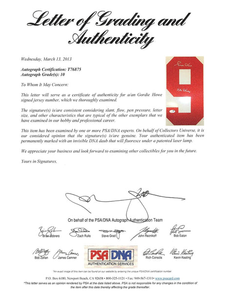 This Autographed Auto Graded Gem Mint 10! White Adidas Size 54 Jersey with the inscription of "Mr. Hockey" has been Personally Signed by Gordie Howe of the Detroit Red Wings. This item is 100% Authentic and comes with a PSA/DNA Certification Card and a matching numbered Hologram. The authenticity can be verified on Professional Sports Authenticator website.