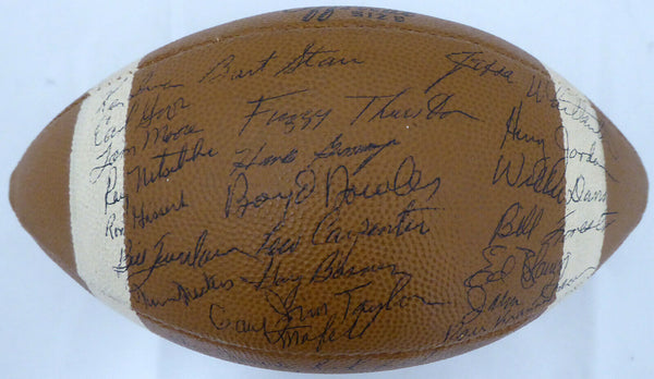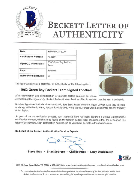 This is a Football that has been hand signed by 39 members of the 1962 Green Bay Packers team. Notable Signatures include Johnny "Blood" McNally (Very Rare), Vince Lombardi, Bart Starr, Fuzzy Thurston, Boyd Dowler, Max McGee, Herb Adderley, Willie Davis, Henry Jordan, Ray Nitschke, Willie Wood, Forest Gregg, Elijah Pitts, Johnny McNally & Jim Taylor. It has been authenticated by Beckett (BAS) and comes with their sticker and matching full page certificate of authenticity.