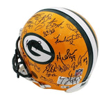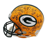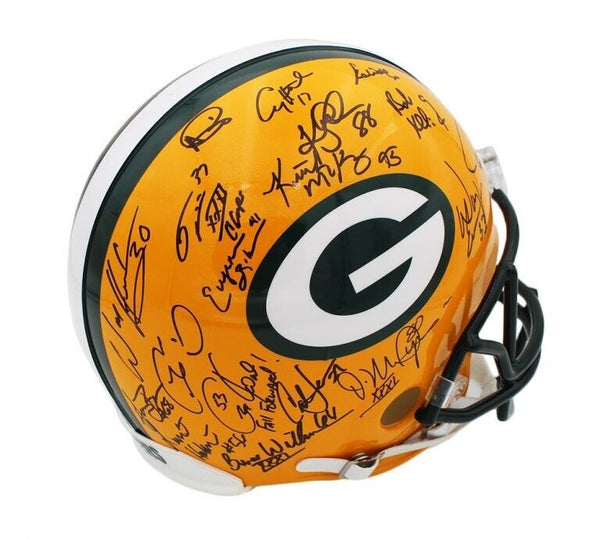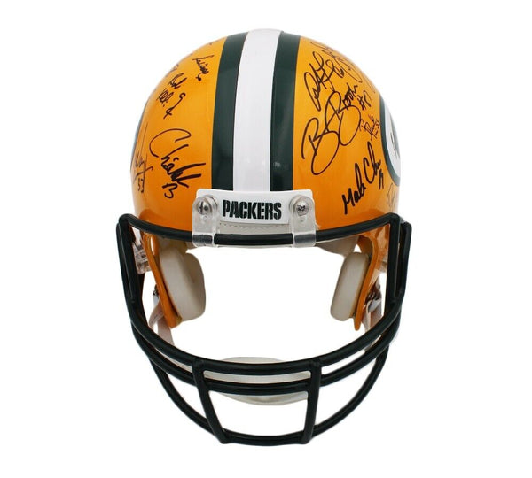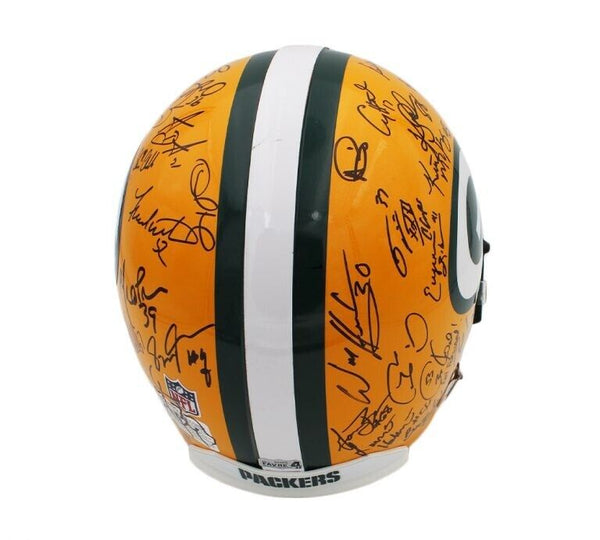 A Green Bay Packers Authentic NFL Helmet hand signed by The 1996 Green Bay Packers Team. Notable signatures include Brett Favre, Ron Wolf, Robert Brooks, Antonio Freeman, Desmond Howard & Dorsey Levens. The Green Bay Packers won Super Bowl XXXI against the New England Patriots in 1996. This was their 3rd Super Bowl Win. The item and signatures are in excellent condition. AUTHENTICATION: The item is accompanied by a Beckett Certificate of Authenticity - Beckett Serial Numbered and Databased Hologram