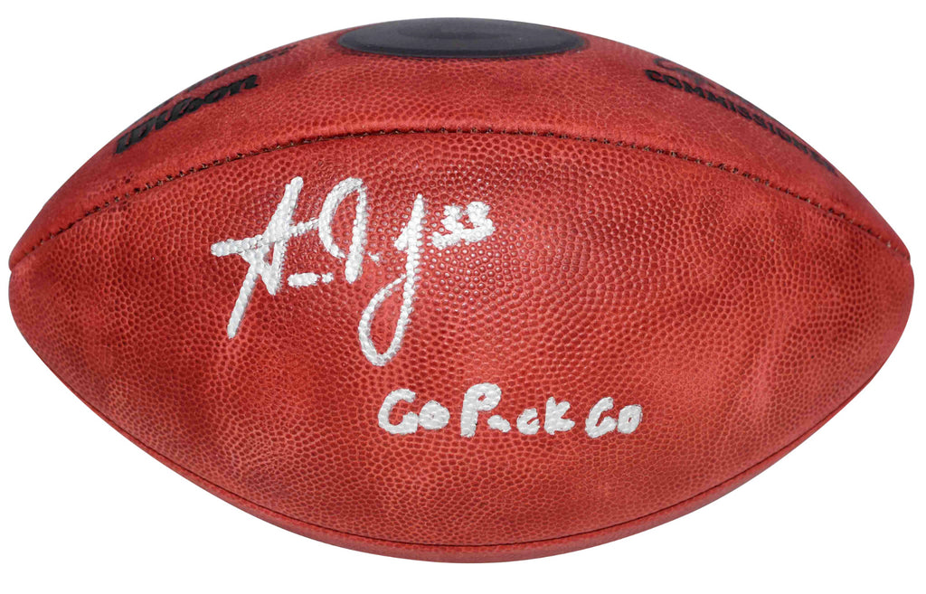Aaron Jones, star running back for the Green Bay Packers, has hand signed this official Wilson Duke game football with metallic team logo. He included the inscription "Go Pack Go" with his signature. This item is authenticated by Beckett Authentication Services and was signed in the presence of one of their representatives. Their tamper-evident hologram featuring a QR code and serial number is on the item. The authenticity can be verified online by entering the serial number or scanning the QR code.Item pictured may not be the exact item you will receive. It will be similar quality, and we guarantee your satisfaction.