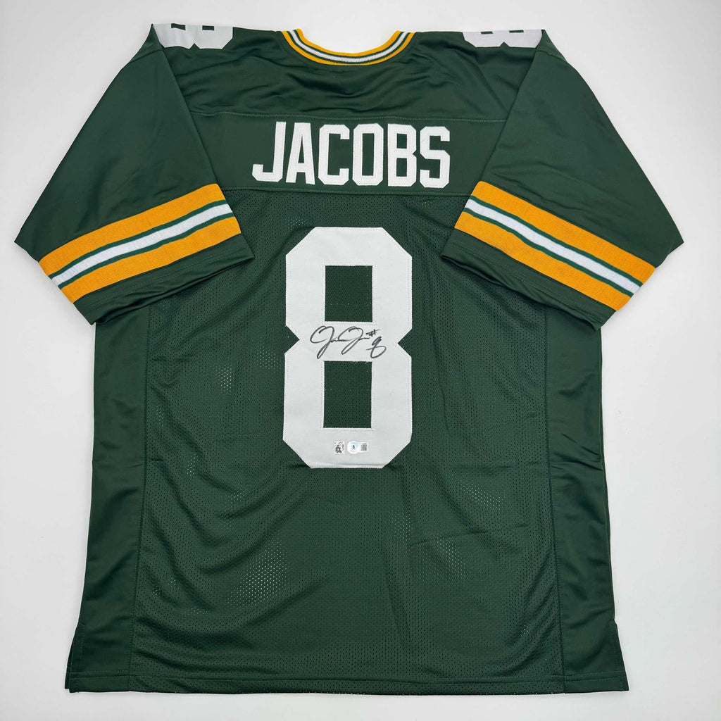 Autographed/Signed Josh Jacobs Green Bay Green Football Jersey Beckett BAS COA Jersey has no brand names or logos. This is a custom jersey and was not manufactured by or in any manner associated with any professional sports league or manufacturer. This custom jersey carries no professional sports league designation. The item is intended to be an autographed collectible. The custom jersey displays the name and number of the player. This item in no way is affiliated with or connected to any professional sports organization. Size is XL.