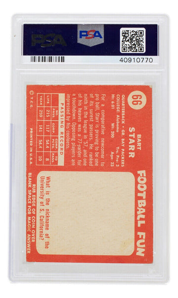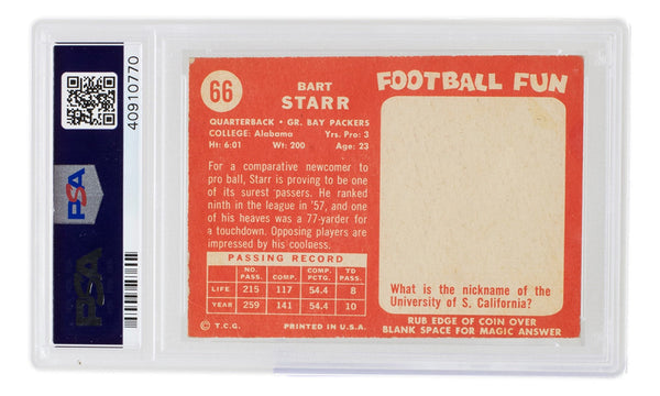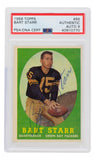 Featured is a Bart Starr signed 1958 Topps Green Bay Packers football card. This card has been signed by Bart Starr and has been slabbed and authenticated by PSA authentication services in which they graded at the autograph a 9 This item would make a great addition to any sports memorabilia collection. SPECIFICATIONS Autographed By: Bart Starr Team: Green Bay Packers Sport: Football Authentication: Professional Sports Authenticator (PSA)