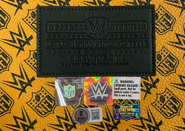 This Green Bay Packers WWE Championship Belt has been personally hand-signed by Brett Favre. It comes with an individually numbered, tamper-evident hologram from Radtke Authentic as well as Beckett. To ensure authenticity, the hologram can be reviewed online. This process helps to ensure that the product purchased is authentic and eliminates any possibility of duplication or fraud.