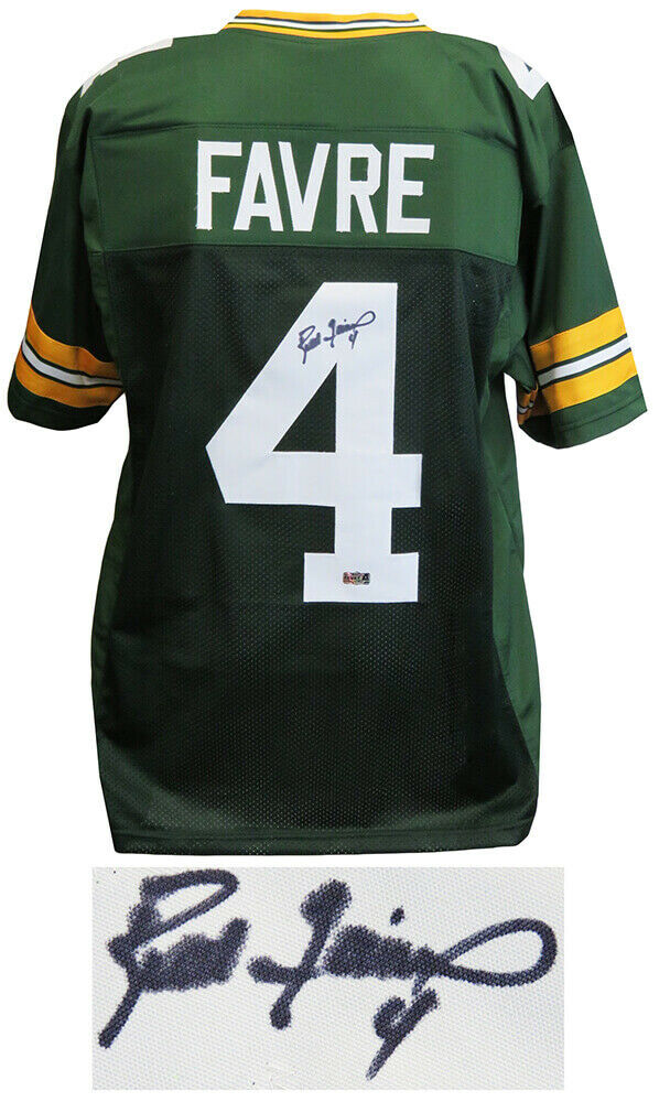 Brett Favre signed green custom football jersey. Item comes with the Brett Favre personal numbered tamper-proof hologram along with a Schwartz Sports Memorabilia tamper-proof numbered hologram and certificate of authenticity which can be verified online. Jersey is size XL.