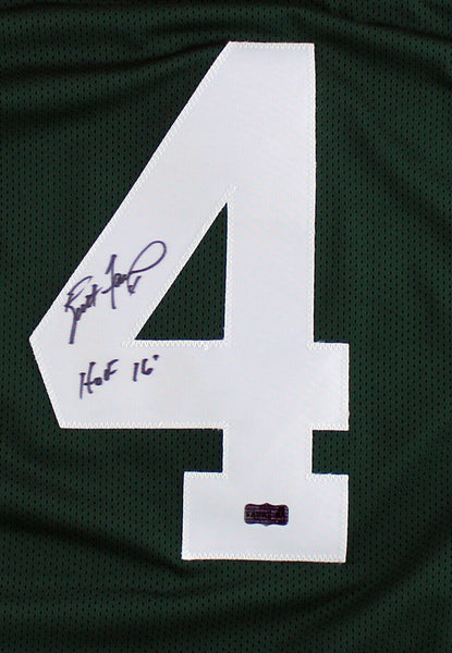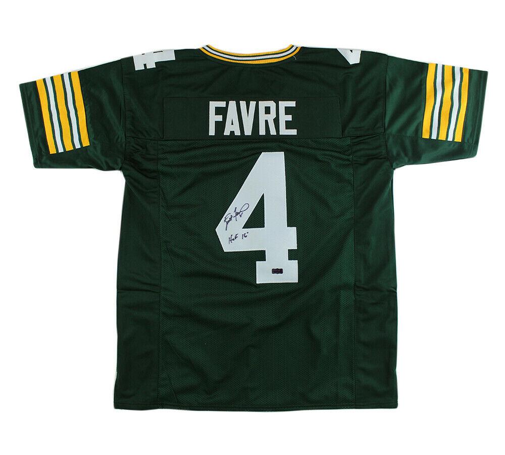 A Green Bay Custom Green Jersey hand signed by Brett Favre. The item and signature are in excellent condition. In addition to signing his name, Brett also inscribed HOF 16 on the item. Brett is one of the most iconic players in NFL history. A 20 year veteran of the NFL, Brett is a Super Bowl Champion, 11x Pro Bowler, 3x AP NFL Most Valuable Player, 4x NFL passing touchdowns leader, and 2x passing yards leader. His number "4" has been retired by both the Green Bay Packers and the Southern Miss Golden Eagles. Brett was inducted into the Pro Football Hall of Fame in 2016. AUTHENTICATION: The item is accompanied by a Brett Favre Exclusive Certificate of Authenticity - Brett Favre Exclusive Serial Numbered and Databased Hologram - Picture of Brett from the signing