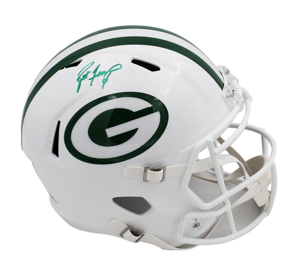 A Green Bay Packers Speed Replica White Alternate 2024 NFL Helmet hand signed by Brett Favre. The item and signature are in excellent condition. Brett is one of the most iconic players in NFL history. A 20 year veteran of the NFL, Brett is a Super Bowl Champion, 11x Pro Bowler, 3x AP NFL Most Valuable Player, 4x NFL passing touchdowns leader, and 2x passing yards leader. His number, 4, has been retired by both the Green Bay Packers and the Southern Miss Golden Eagles. Brett was inducted into the Pro Football Hall of Fame in 2016. AUTHENTICATION: The item is accompanied by a Brett Favre Exclusive SmarTag powered by Prova Technology and a picture of Brett from the Signing -