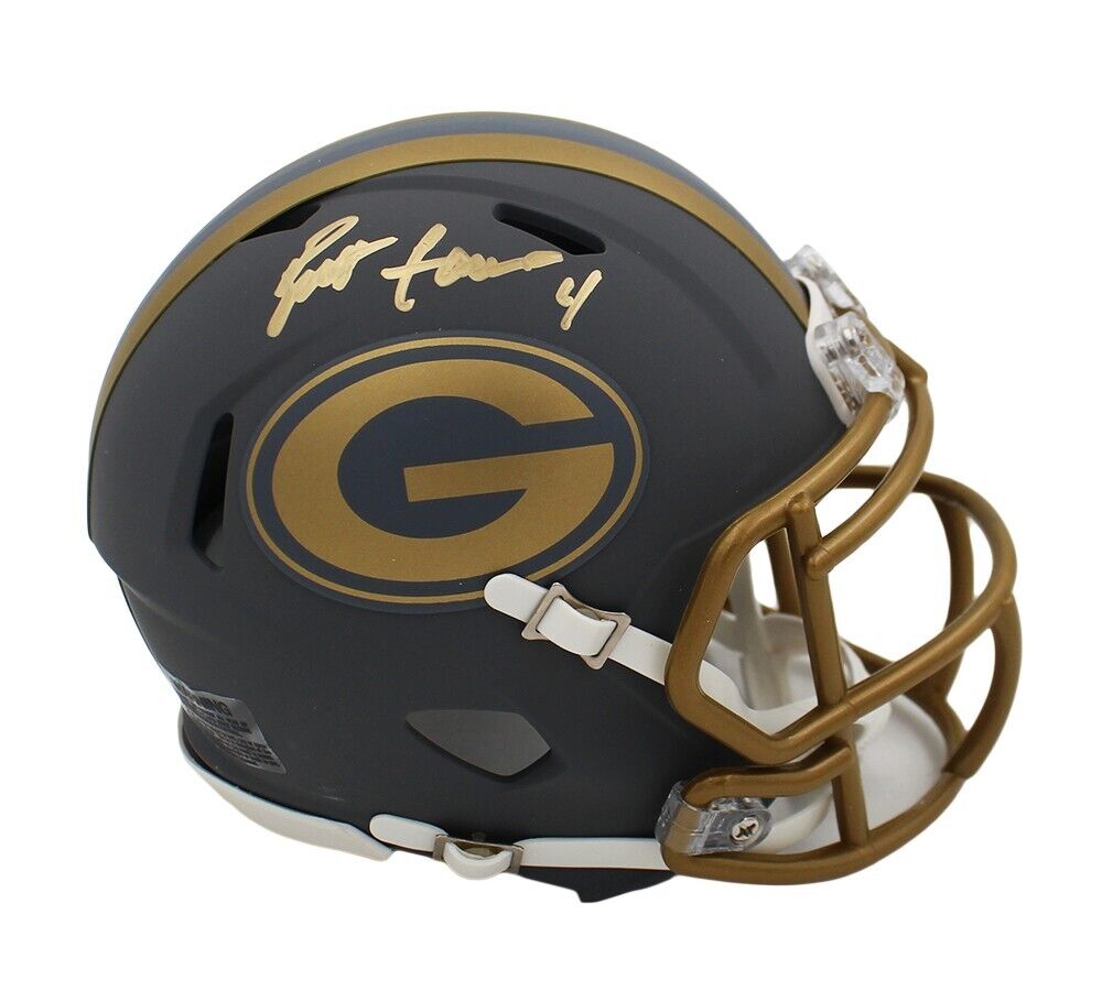 A Green Bay Packers Speed Slate NFL Mini Helmet hand signed by Brett Favre. The item and signature are in excellent condition. Brett is one of the most iconic players in NFL history. A 20 year veteran of the NFL, Brett is a Super Bowl Champion, 11x Pro Bowler, 3x AP NFL Most Valuable Player, 4x NFL passing touchdowns leader, and 2x passing yards leader. His number, 4, has been retired by both the Green Bay Packers and the Southern Miss Golden Eagles. Brett was inducted into the Pro Football Hall of Fame in 2016. AUTHENTICATION: Your item has been tagged with a Brett Favre Exclusive SmarTag powered by Prova Technology, which gives you digital access to your items authentication records, including a proof picture from the signing.