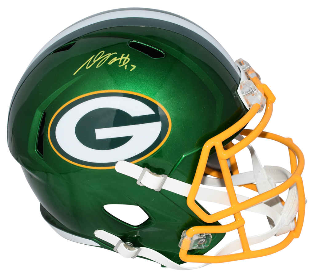 Davante Adams, former Pro Bowl wide receiver for the Green Bay Packers, has hand signed this Packers Riddell Speed Flash full-size replica helmet at a private signing. This item is authenticated by Beckett Authentication Services, one of the best authenticators in the industry. Their tamper-evident hologram featuring a QR code and serial number is on the item. The authenticity can be verified online by entering the serial number or scanning the QR code.Item pictured may not be the exact item you will receive. It will be similar quality, and we guarantee your satisfaction.