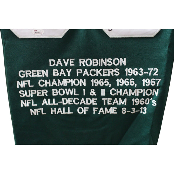 The number in the listing title is just an inventory sku for our records and is not the authentication number. This is the exact item that you will receive so please see pictures for condition. This is a custom green jersey wih sewn on name and numbers that was personally autographed by Dave Robinson with inscriptions. Includes a certificate of authenticity from James Spence Authentication (JSA) and Denver Autographs.