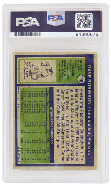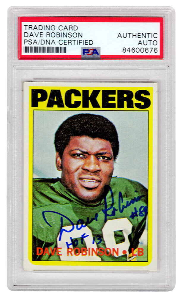 Dave Robinson signed Green Bay Packers 1972 Topps football trading card #116 with 'HOF 2013' inscription. The card has been authenticated and encapsulated by PSA/DNA and the number can be verified online. The image of the item is a stock photo, as we may have multiples of the item in stock. The Slabbed Card you will receive will be of the card described. (Same grade, Same authentication) You may or may not receive the exact PSA serial number on the slab label shown in image.