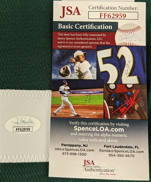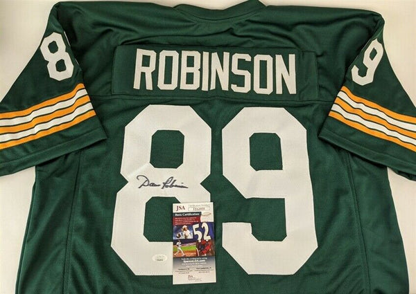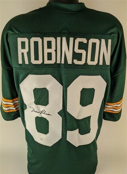 Custom on-field style jersey. Everything is sewn on, size XL. Hand-signed in black felt-tip pen by Dave Robinson (HOF). The lot / autograph(s) includes an official James Spence Authentication (JSA) hologram and matching COA for authenticity purposes.Authentication: JSA COA