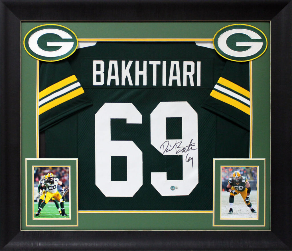 This Autographed Green Pro Style Framed Jersey has been Personally Signed by David Bakhtiari of the Green Bay Packers. This item is 100% Authentic to include a hologram by Beckett Authentication Services. This item will come with an affixed Beckett Authentication Services (BAS) authentication sticker, which includes a scannable QR code to verify authenticity. Please note that Beckett no longer provides serial-numbered COA cards, and the attached BAS sticker will serve as the complete authentication for this item. We conducted an autograph signing with David Bakhtiari where multiples of the same item were signed. While the photographs are representative of this item, the size, placement and strength of the signature may vary. Each item is hand signed, therefore, each autograph is unique. This item can be verified through BAS. This item has been professionally framed to overall dimensions of approximately 32 x 37 inches. This is a X-Large sized, non-branded, custom-stitched Framed Jersey. This jersey will be framed to order, it will take 3-4 days from purchase date for it to ship.