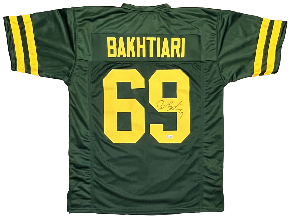 David Bakhtiari, star left tackle for the Green Bay Packers, has hand signed this green custom jersey at a private signing. Jersey is size XL and all letters/numbers are sewn-on. This item is authenticated by Beckett Authentication Services and was signed in the presence of one of their representatives. Their tamper-evident hologram featuring a QR code and serial number is on the item. The authenticity can be verified online by entering the serial number or scanning the QR code.Item pictured may not be the exact item you will receive. It will be similar quality, and we guarantee your satisfaction.
