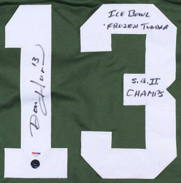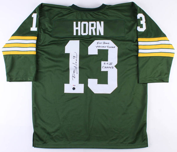 Custom on-field style jersey. Everything is sewn on, size XL. Hand-signed and inscribed in black felt-tip by Don Horn. The lot / autograph(s) includes an official PSA/DNA hologram for authenticity purposes.Authentication: PSA Hologram