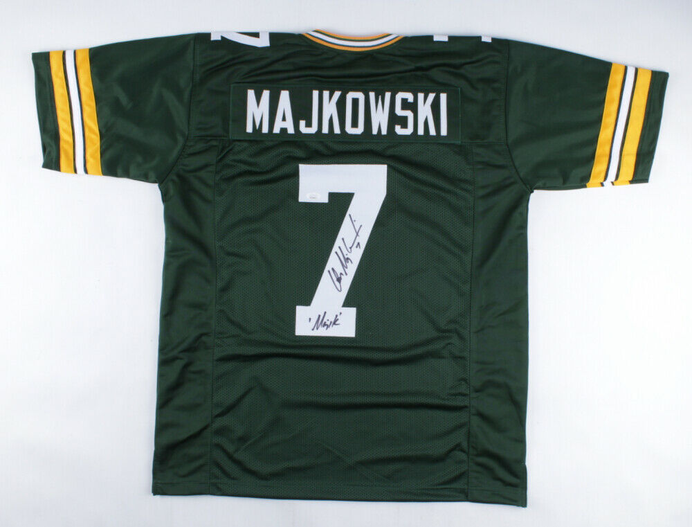 Custom on-field style jersey with everything sewn on, size XL. Hand-signed in black felt-tip pen by Don Majkowski. (Packers, Colts, Lions) This autograph is certified by James Spence Authentication's (JSA) Witnessed Protection Program. That means that a JSA representative was present when this item was signed. It comes with the numbered hologram and matching Certificate of Authenticity. Authentication: JSA COA