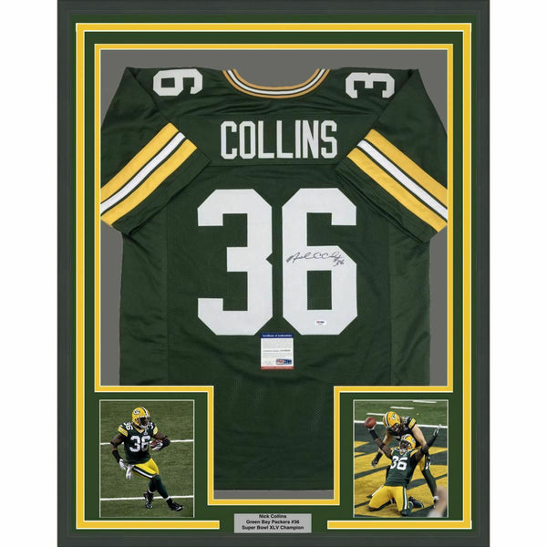 FRAMED Autographed/Signed NICK COLLINS 33x42 Green Bay Green Jersey PSA/DNA COA The item is professionally framed & matted with two 8x10 photos, measures 33"x42" and is ready to be hung in your man cave! NOTE: COA card will be mounted on the back of the frame, not inside it on top of the jersey as seen in the picture. Please allow up to 5 business days for the item to be framed, packaged safely, and picked up by USPS. Photo and matting requests can be made.