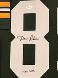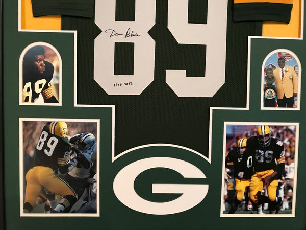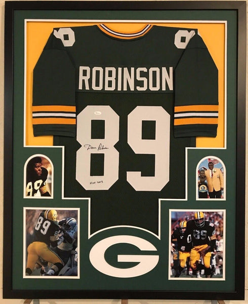 Framed Randall Dave Robinson signed inscribed "HOF 2013" Green Bay Packers Custom Jersey. JSA Hologram and COA(#WP493707) The authentication is from JSA. This signature is not authenticated by opinion, but is WITNESSED by a representative of JSA! 100% AUTHENTIC!!! The jersey has fully stitched numbers on the front and back. No tags or logos. This is not an official NFL jersey but it is very high quality. It is a great item and a must for all great sports fans! This item is professionally framed, it measures 32"x40" inside , 42"x34" outside , using UV protective Acrylic glass for safe keeping and safe transport, team color matting, black moulding and hanging hooks on the back. All additional items in frame seen in pictures included. 100% ready to hang in your fan cave.