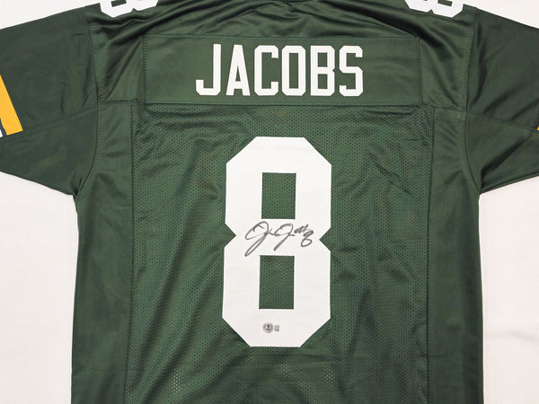 This is a Green Jersey that has been hand signed by Josh Jacobs. This is a custom jersey with no name brand. The approximate size is XL. It has nice sewn in name and numbers. This item has been witnessed and certified authentic by Beckett Authentication (BAS) and comes with their tamper-proof witness sticker.