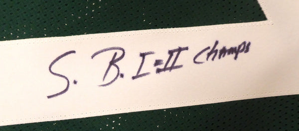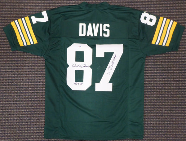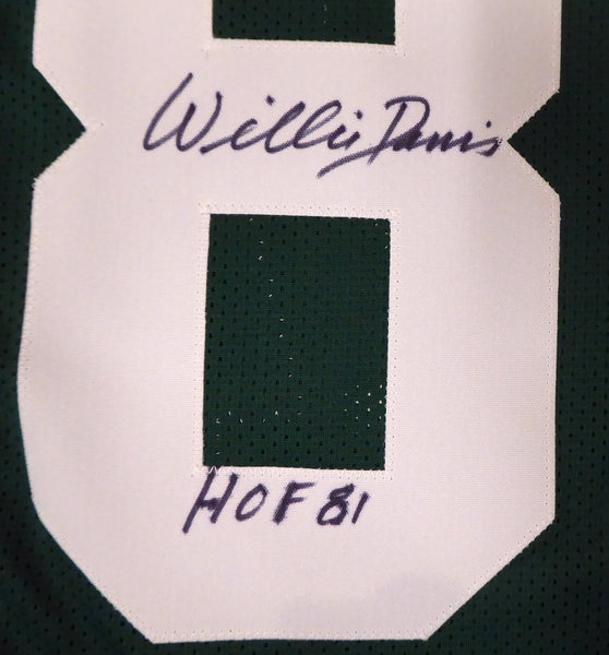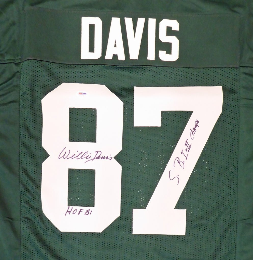 This is a Green Custom Jersey that has been hand signed by Willie Davis. This is a custom jersey with no name brand. The approximate size is XL. It has nice sewn in name and numbers. This item has been certified authentic by PSA/DNA and comes with their sticker and matching certificate of authenticity.