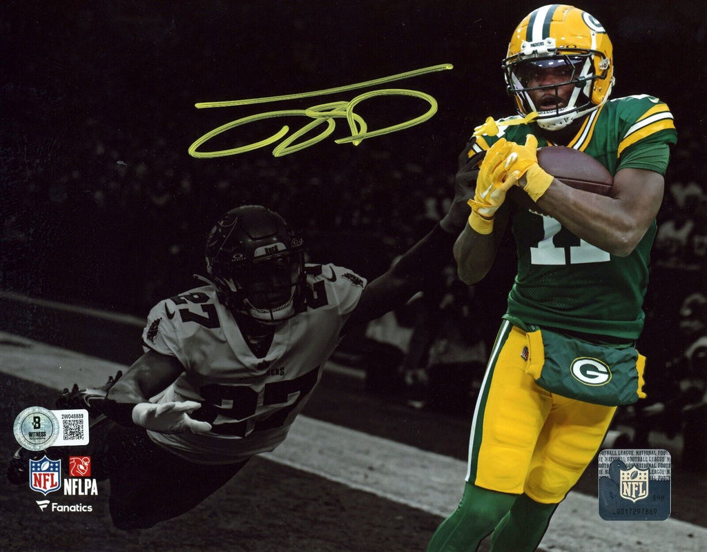 Jayden Reed, star wide receiver for the Green Bay Packers, has hand signed this 8x10 photo at a private signing. This item is authenticated by Beckett Authentication Services and was signed in the presence of one of their representatives. Their tamper-evident hologram featuring a QR code and serial number is on the item. The authenticity can be verified online by entering the serial number or scanning the QR code.Item pictured may not be the exact item you will receive. It will be similar quality, and we guarantee your satisfaction.