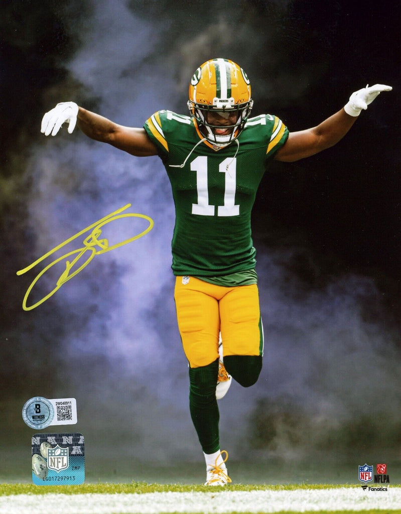Jayden Reed, star wide receiver for the Green Bay Packers, has hand signed this 8x10 photo at a private signing. This item is authenticated by Beckett Authentication Services and was signed in the presence of one of their representatives. Their tamper-evident hologram featuring a QR code and serial number is on the item. The authenticity can be verified online by entering the serial number or scanning the QR code.Item pictured may not be the exact item you will receive. It will be similar quality, and we guarantee your satisfaction.