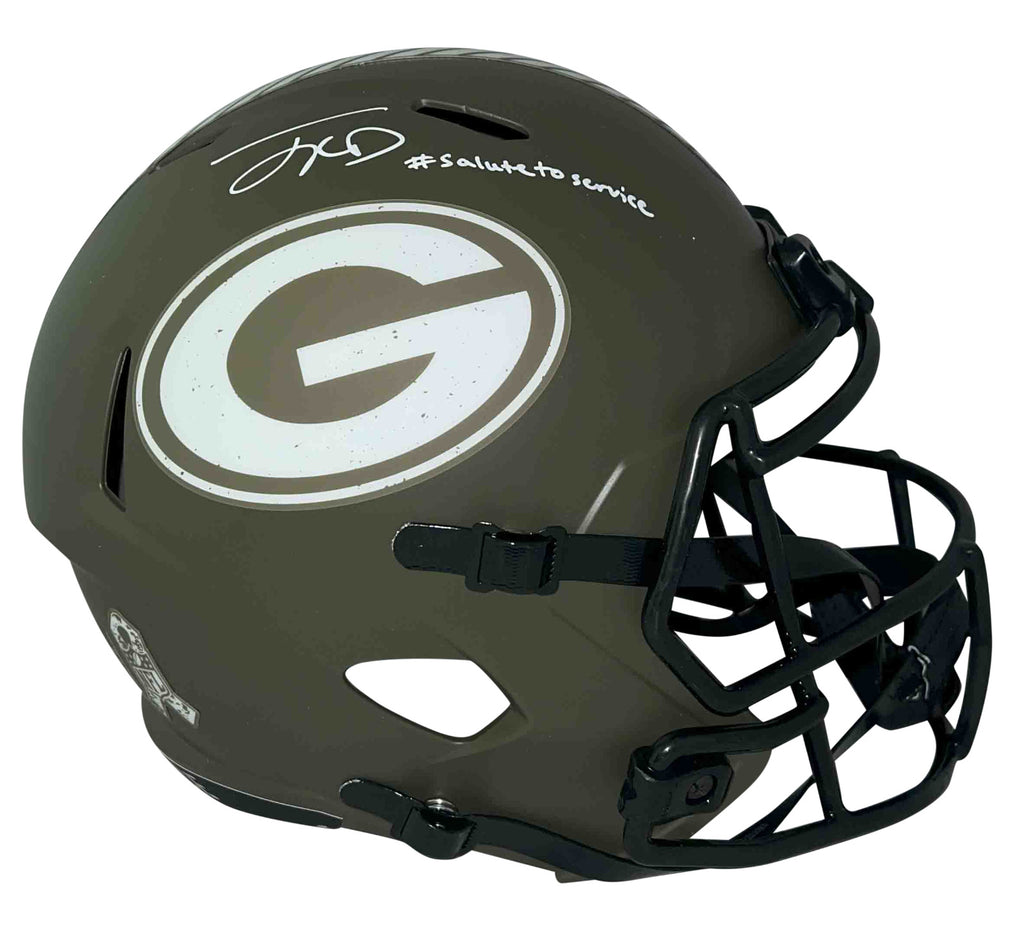 Jayden Reed, star wide receiver for the Green Bay Packers, has hand signed this Packers Riddell Speed Salute to Service full-size replica helmet at a private signing. He included the inscription "Salute to Service". This item is authenticated by Beckett Authentication Services and was signed in the presence of one of their representatives. Their tamper-evident hologram featuring a QR code and serial number is on the item. The authenticity can be verified online by entering the serial number or scanning the QR code.Item pictured may not be the exact item you will receive. It will be similar quality, and we guarantee your satisfaction.