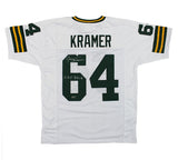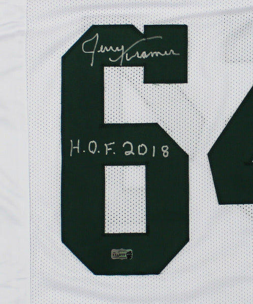 A Green Bay Custom White Short Sleeve Jersey hand signed by Jerry Kramer. The item and signature are in excellent condition. In addition to signing his name, Jerry also inscribed "HOF 2018" on the item. Jerry is a 2x Super Bowl Champion, 5x NFL Champion, 3x Pro Bowler, and is in the Green Bay Packers Hall of Fame. AUTHENTICATION: The item is accompanied with a Jerry Kramer Exclusive Certificate of Authenticity - Jerry Kramer Exclusive Serial Numbered and Databased Hologram - Picture of Jerry from the Signing.