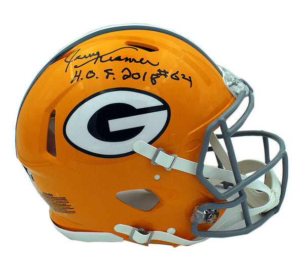 A Green Bay Packers Speed Authentic Throwback NFL Helmet hand signed by Jerry Kramer. The item and signature are in excellent condition. In addition to signing his name, Jerry also inscribed "HOF 2018" on the item. Jerry is a 2x Super Bowl Champion, 5x NFL Champion, 3x Pro Bowler, and is in the Green Bay Packers Hall of Fame. AUTHENTICATION: The item is accompanied with a Jerry Kramer Exclusive Certificate of Authenticity - Jerry Kramer Exclusive Serial Numbered and Databased Hologram - Picture of Jerry from the Signing.